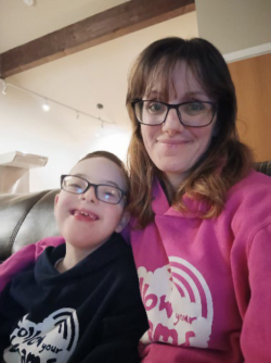 Mae gan Caleb o dde Cymru Syndrom Down, Anawsterau Dysgu Cyffredinol, Gorsymudedd ac ADHD ac mae angen gofal 24/7 arno. Mae ei fam Nicola hefyd wedi’i chofrestru’n anabl gyda chyflwr prin ar ei llygaid.