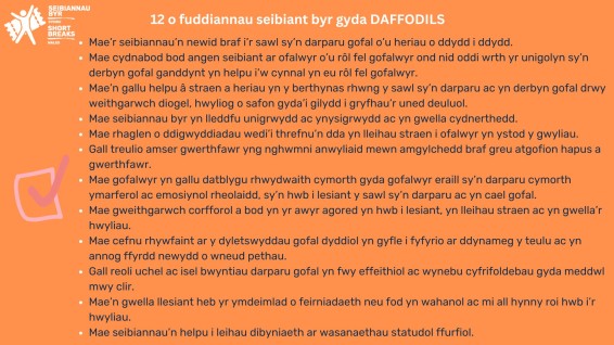 Dywed DAFFODILS wrthym, “Mae treulio amser gwerthfawr gyda’u hanwyliaid sy’n derbyn gofal a chreu atgofion hapus mor bwysig i rieni sy’n ofalwyr. Mae teuluoedd yn teimlo eu bod yn cael eu gwerthfawrogi a’u deall yn well. Mae’r seibiannau’n lleddfu llawer o’r straen mae gofalwyr yn ei brofi o ganlyniad i’w dyletswyddau gofal, gan eu galluogi i ymlacio a chael eu gwynt atynt. Mae’r cyfleoedd a geir i ryngweithio â rhieni eraill sy’n ofalwyr, i rannu profiadau ac i feithrin perthnasoedd cefnogol yn gallu newid bywydau.”